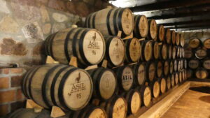 En la primera destilación obtienen 20º de alcohol, y en la segundase concentra entre 50 y 55º (cuentan con un enfriador de cobre). Dicen que el bagazo ayuda a arrancar antes la fermentación y le aporta más sabor. Separan las cabezas y las colas en las dos destilaciones, cuyos alambiques se calientan con leña. Prefieren el jimado de las piñas en junio, por ser temporada más seca, y nos cuentan que desarrollan las semillas un año en vivero antes de plantarlas en el campo. Visitamos su cava de barricas, de unos 100 litros de roble blanco americano.